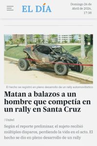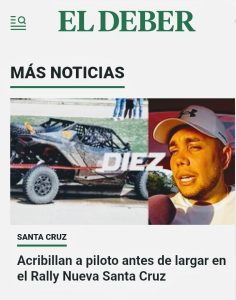 Lo de Rafael Mendoza en punta era deleite para la gente en la ruta con Martínez que era su sombra, Roly Roca no se quedaba atrás, ni que decir Brayan Suárez, von Juan Carlos Meneses también más veloz que el resto de los 57 pilotos que corrían al ritmo de ellos, 62 en total, siendo que el Rally La Nueva Santa Cruz, la segunda del Campeonato Cruceño de Rally 2026, era todo un éxito en base a lo organizado por Adecruz, pero ocurrió lo inesperado, porque mataron a José Pedro Rojas Velasco, que esta vez se anotó para correr en SXS Racing (corría en RC-2), por lo planificado por su persona para esta temporada, algo ocurrido en pleno trajín competitivo, en un suceso de sangre a mano armada, tras finalizada la mitad de la manga dominical, luego del Shawedown que hubo sábado.