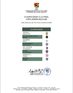Del 10 al 14 de noviembre en la capital cruceña, finales para ver que equipos suben a Primera División del Futsal Boliviano FIFA siendo que Águilas sacó la cara por Santa Cruz luego de que BJLR quedara en el camino al ser eliminado en semis.